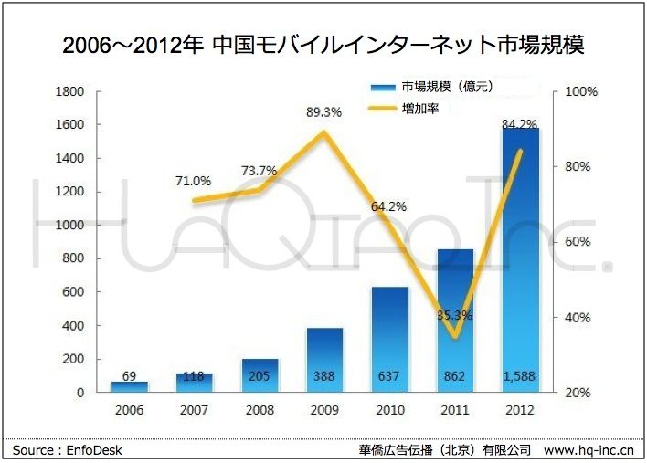 2012年中国モバイルインターネット市場規模は、1588億元(約2兆1738億円)です。