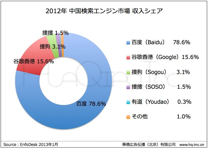 2012年8月、新たに市場参入した「奇虎360(360:サンリューリン)」は検索クエリシェアで7.4%を獲得し、現在中国検索エンジン第2位となっています。