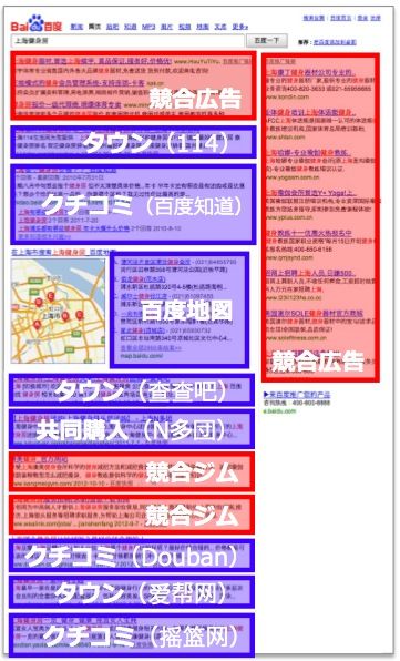- 主要なタウン情報・口コミ情報内で「上海スポーツジム」カテゴリの上位表示→百度検索結果ページの「タウン情報・口コミ情報」内でも掲載